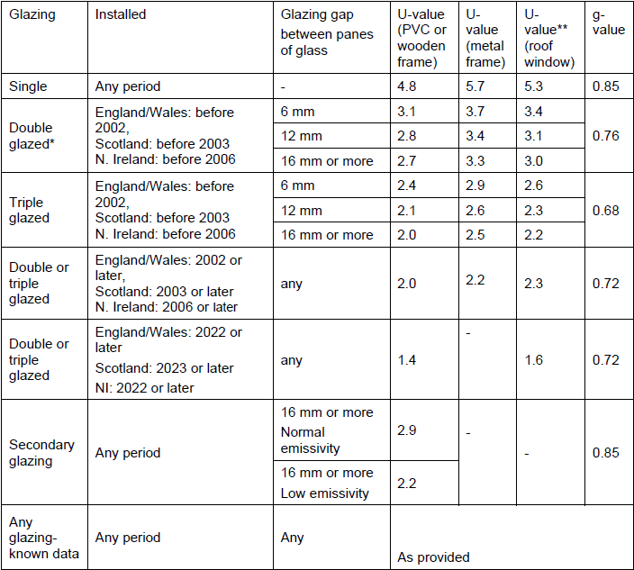 So, this table indcates the U and g values for each type of glazing that are used by RDSAP 10 by default towards calculation of the EPC rating, and are a measure of the thermal performance of the glazing: